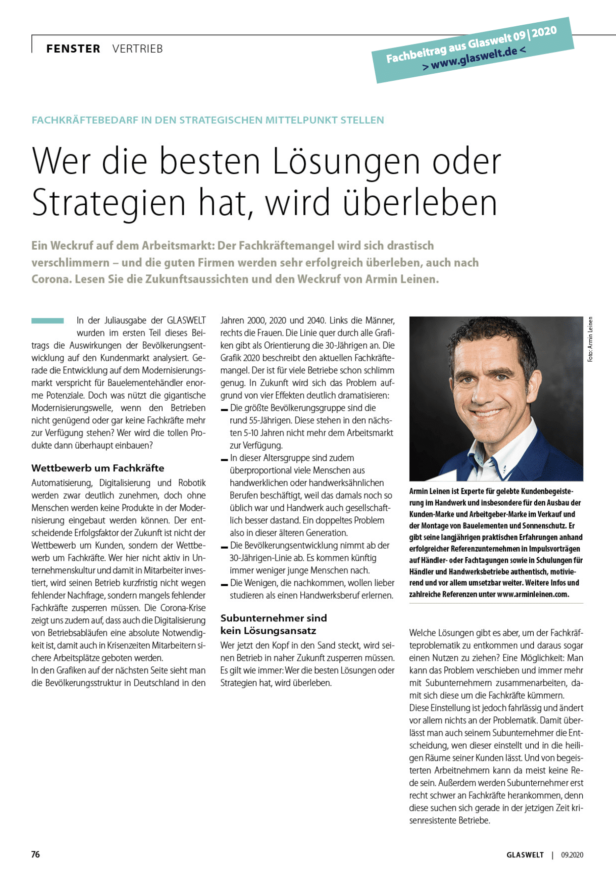 Ein Weckruf auf dem Arbeitsmarkt: Der Fachkräftemangel wird sich drastisch verschlimmern - und die guten Firmen werden sehr erfolgreich überleben, auch nach Corona. Lesen sie die Zukunftsaussichten und den Weckruf von Armin Leinen.